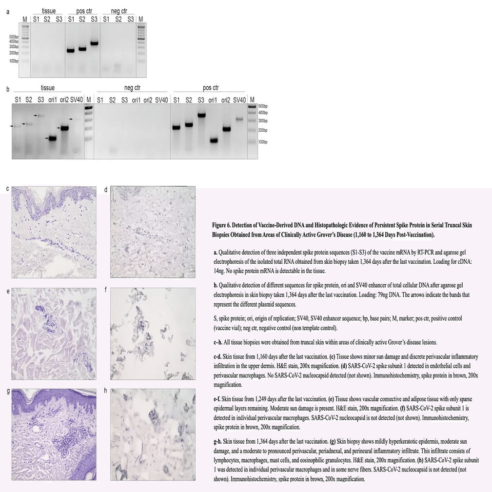 ワクチン接種後1,160日、1,249日、1,364日における連続皮膚生検(いずれも臨床的に活動性のグローバー病領域内の体幹皮膚)は、ヌクレオカプシド陰性であり、自動免疫組織化学染色と組織病理学的相関により、内皮細胞およびマクロファージに持続的なスパイクタンパク質沈着が認められました。また、1,364日には神経線維にもスパイクタンパク質が認められました。